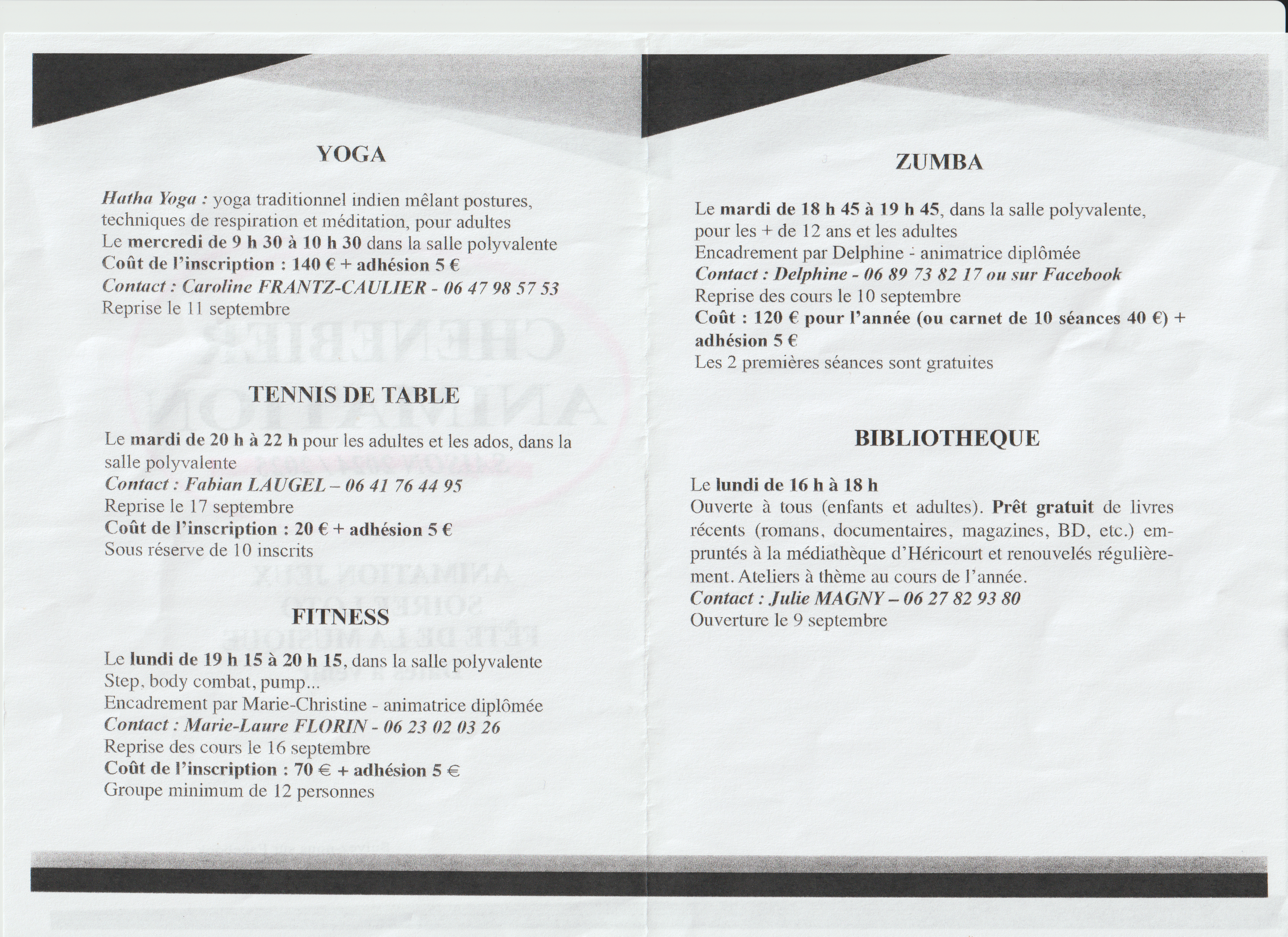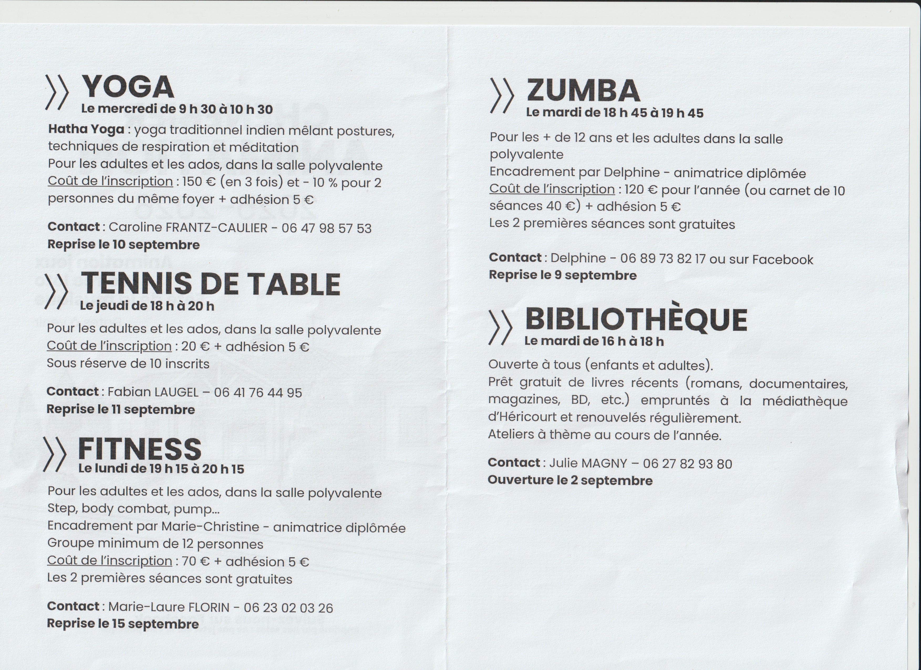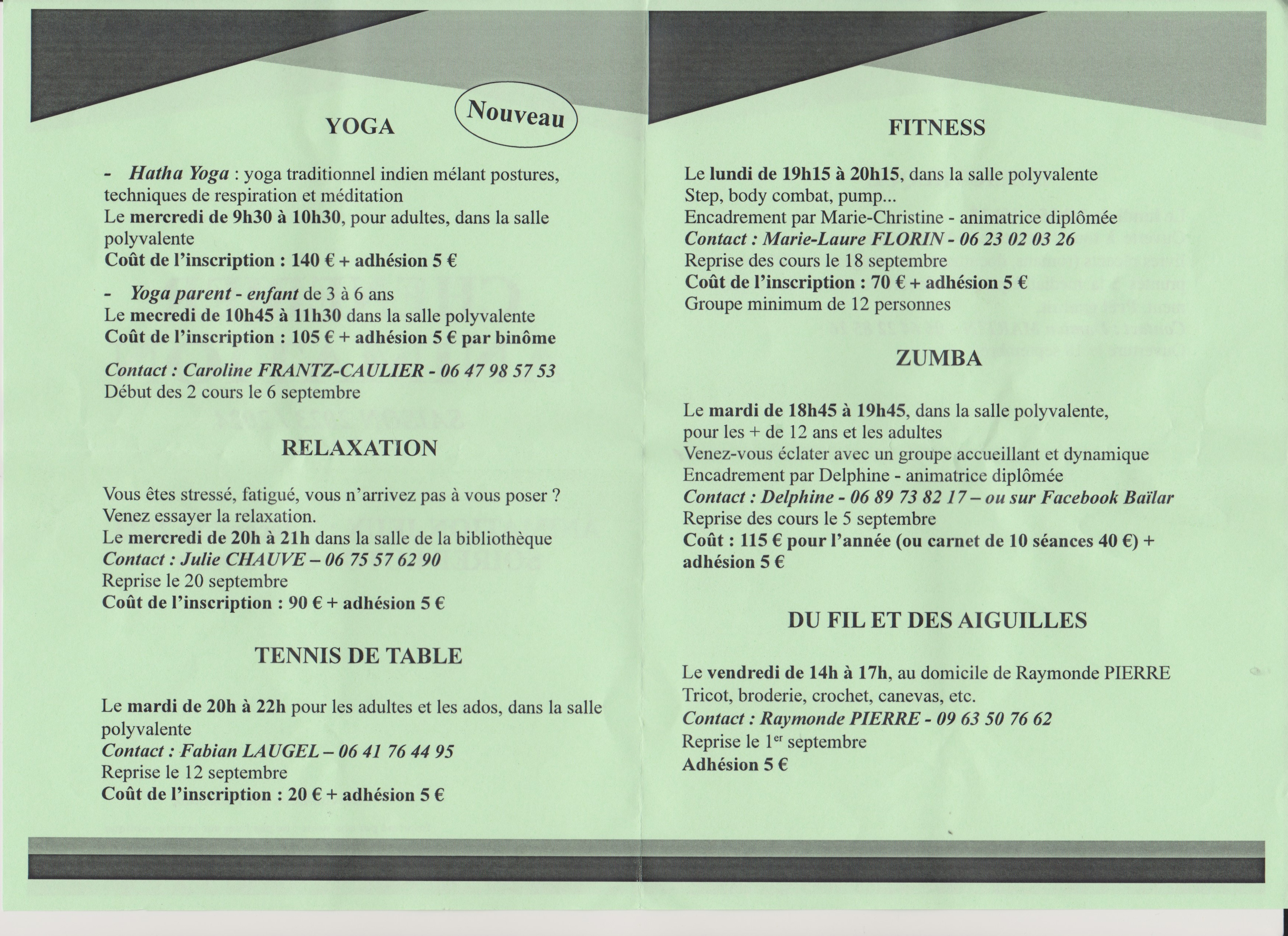 Les activités proposées : Yoga ,Fitness, zumba, ainsi que tennis de table, et la bibliothèque (avec l'aide de la Municipalité)